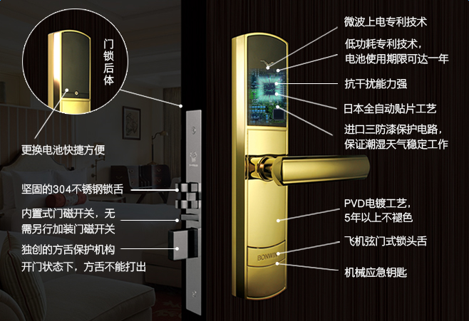 1、锁壳和把手表面PVD电镀工艺,保证5年以上不褪色;